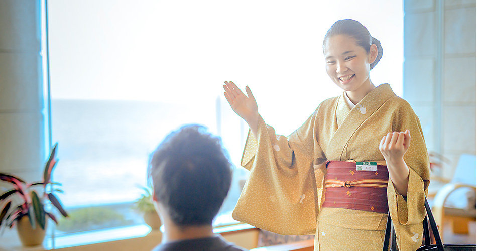 浜の湯の売りは料理。そしてそのお料理は夕食も朝食もお部屋出しで、担当の客室係が行う。つまりお出迎えからお見送りまでを完全担当制でお世話するという、本来の日本旅館のおもてなしが浜の湯の魅力です。このお出迎えからお見送りまで一人が担当するという仕組みは、日本旅館にしかないおもてなしです。すばらしい文化だと私は思います。仲居さんが純粋に、お客様の一日を最高のものにしてあげたいと願い、寄り添い、お客様と共有する時間を楽しみながら作り上げる幸せな時間。